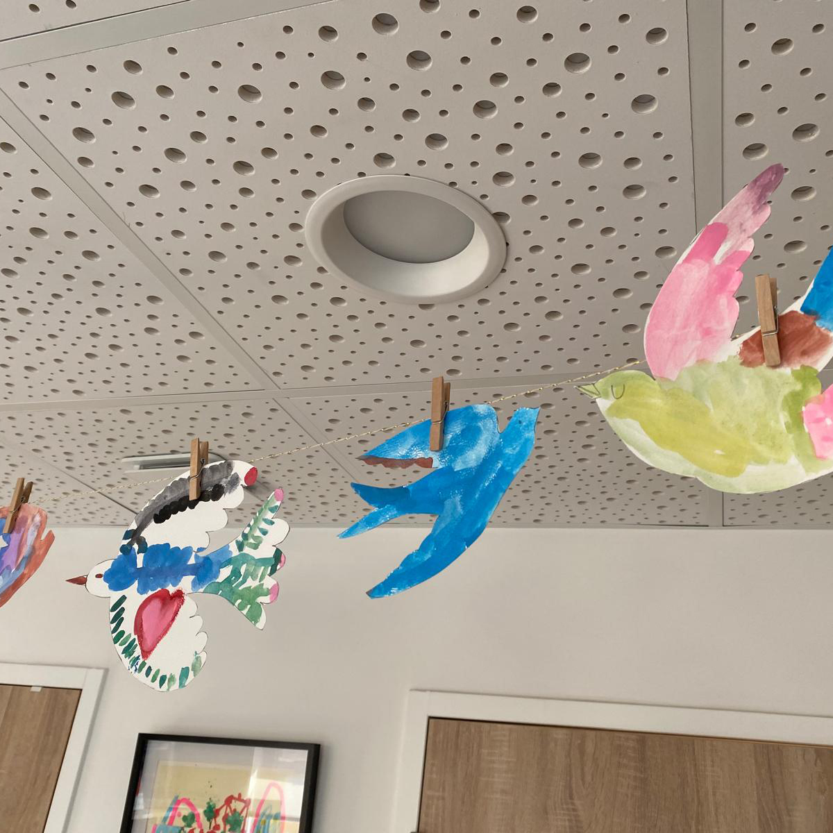 Drawing, breathing, and re-centering activities are offered there to help identify, express, and regulate emotions. This individual time also helps to understand that peace is first built within oneself: learning to calm down, to listen to oneself, and then to reconnect with others in serenity. Doves, a sign of peace, were also decorated.