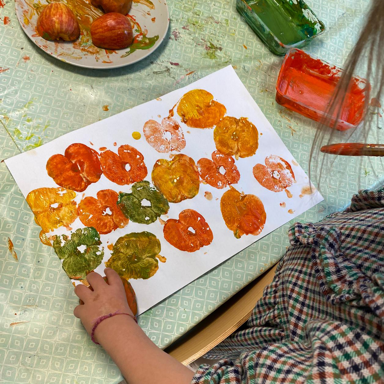 Sensory exploration continued with modelling and the making of scented, coloured, and textured dough (lavender, orange, and pine). Collective autumn land art creations were made, and we practiced making apple and leaf prints.
